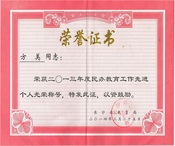 方主任被评为“民办教育工作先进个人”的光荣称号。